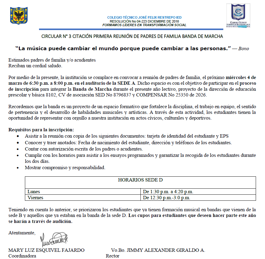 Citación a padres de familia o acudientes de los estudiantes interesados en participar en la Banda de Marcha Sede D. Por favor leer la circular atentamente y asistir en el horario estipulado.