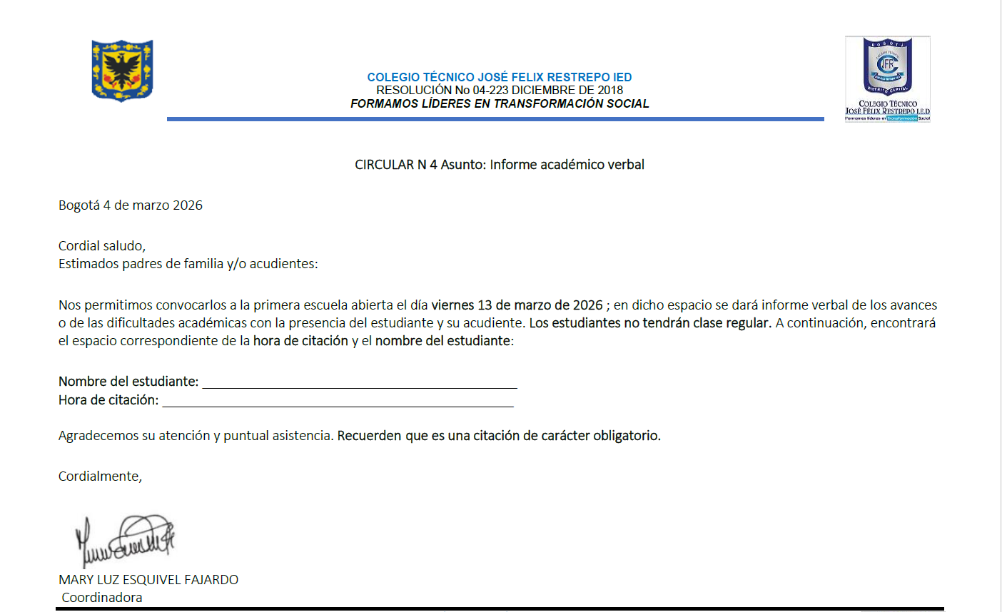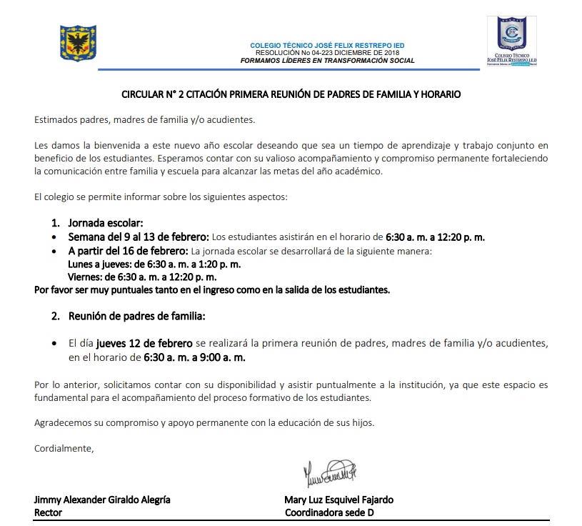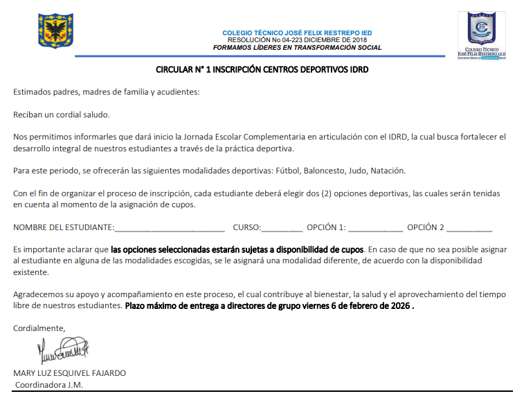 Nos complace informarles que daremos inicio a la Jornada Escolar Complementaria en articulación con el IDRD, el cual busca fortalecer el desarrollo integral de nuestros estudiantes mediante la práctica deportiva. Para participar, cada estudiante debe diligenciar y entregar la circular debidamente diligenciada a su director de grupo.